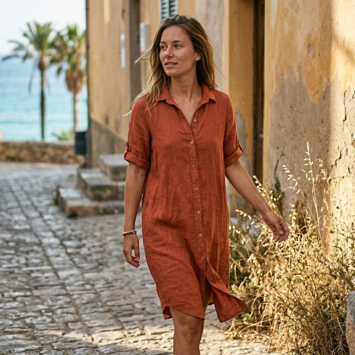 De blouse is gemaakt van een kwalitatief hoogwaardige 100% puur linnen stof van Europese afkomst, door de van nature ademende eigenschappen van linnen is deze stof koel te dragen in de zomer.