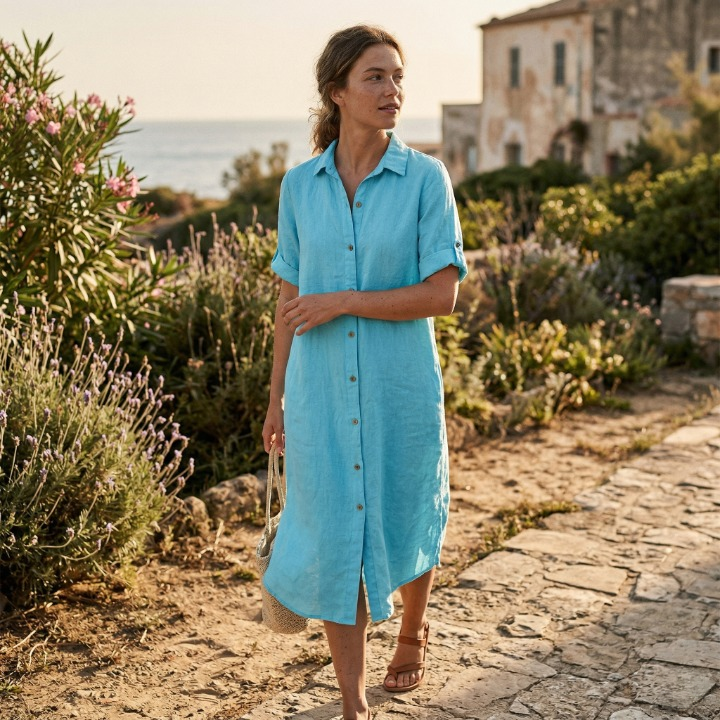 De blouse is gemaakt van een kwalitatief hoogwaardige 100% puur linnen stof van Europese afkomst, door de van nature ademende eigenschappen van linnen is deze stof koel te dragen in de zomer.
